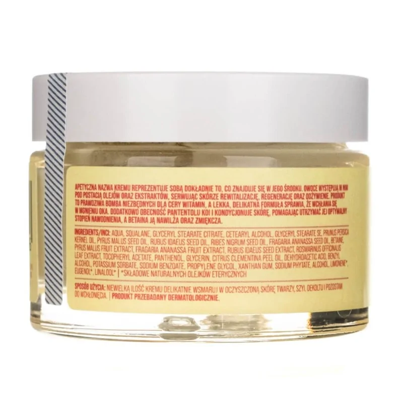 Aqua, Squalane, Glyceryl Stearate Citrate, Cetearyl Alcohol, Glyceryl Stearate SE, Prunus Persica Kernel Oil, Pyrus Malus Seed Oil, Rubus Idaeus Seed Oil, Ribes Nigrum Seed Oil, Fragaria Ananassa Seed Oil, Betaine, Pyrus Malus Fruit Extract, Fragaria Ananassa Fruit Extract, Rubus Idaeus Seed Extract, Rosmarinus Officinalis Leaf Extract, Tocopheryl Acetate, Panthenol, Glycerin, Citrus Clementina Peel Oil, Dehydroacetic Acid, Benzyl Alcohol, Potassium Sorbate, Sodium Benzoate, Propylene Glycol, Xanthan Gum, Sodium Phytate, Alcohol, Limonene*, Eugenol*, Linalool*. *-składowe naturalnych olejków eterycznych